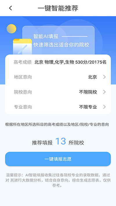 5、再点击下方的【AI智能填报】按钮,完成各项意向即可 模拟志愿填报 。