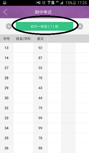 3、点击上方“切换班级”按钮,可以查看本次考试不同班级成绩。