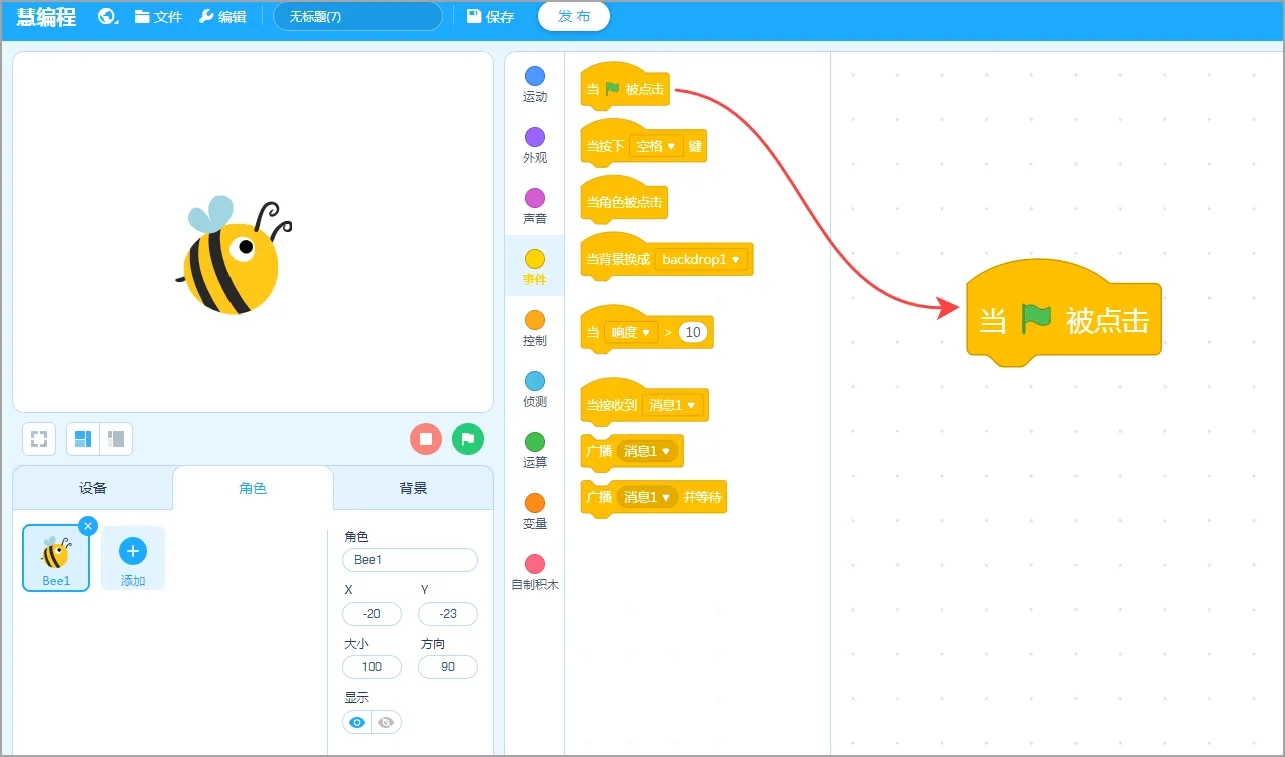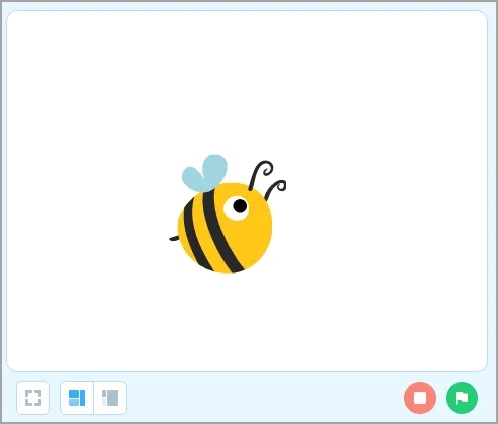 3)点击舞台下方的绿色旗帜,小蜜蜂就动起来啦。