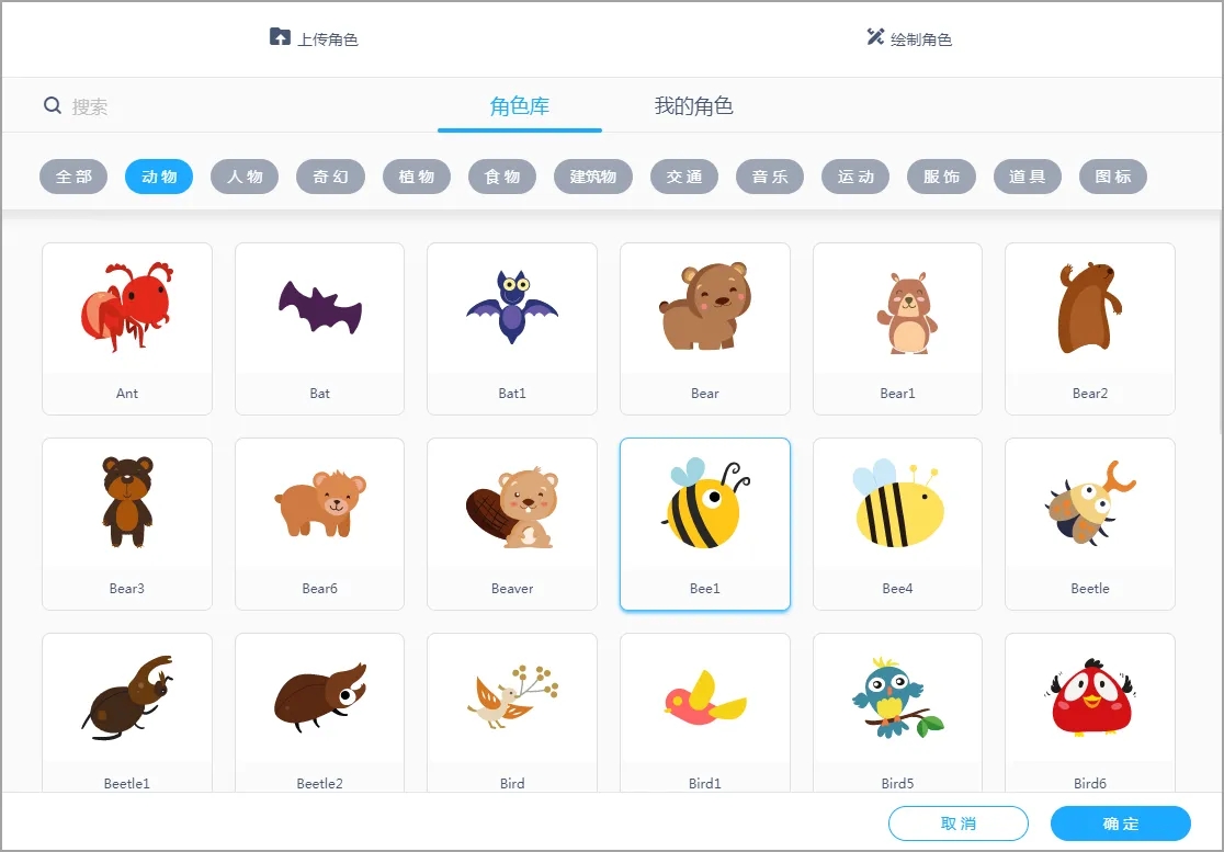 2)在弹出的“角色库”窗口中选择你需要的角色。这里,我们选择"Bee1",然后点击“确定”。