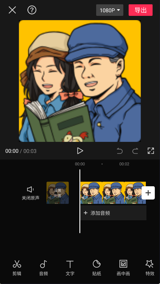 4、音乐剪辑一体化,本地导入音频后直接切割调整时长匹配画面。
